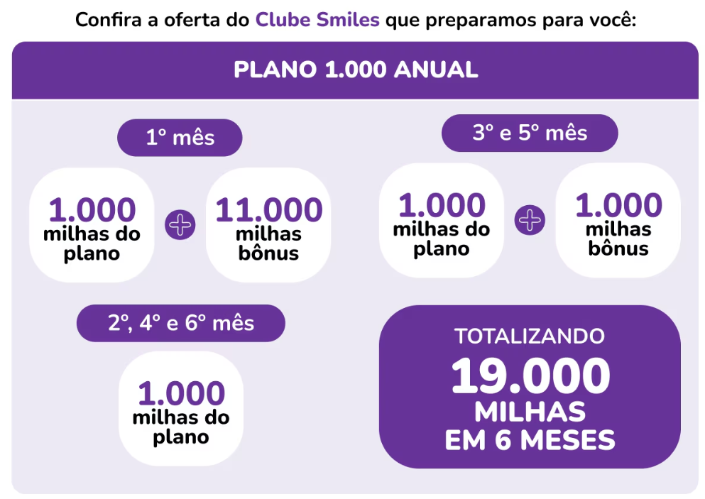- Assinatura Anual – 19.000 milhas (11.000 de bônus na adesão + 1.000 de bônus no 3° e 5° mês + 1.000 do Clube até o 6° mês)