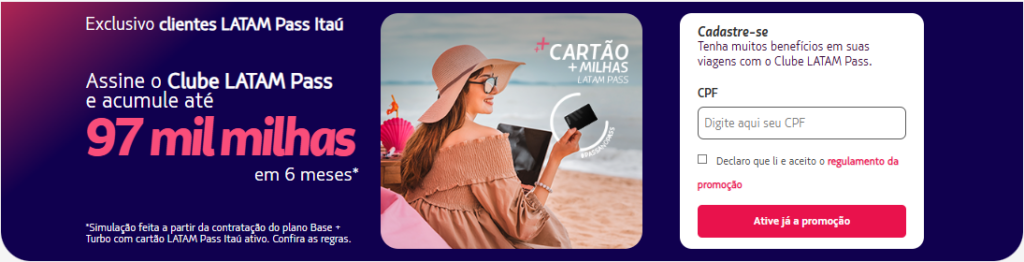 - Promoção válida para titulares ativos do cartão de crédito LATAM Pass Itaú;