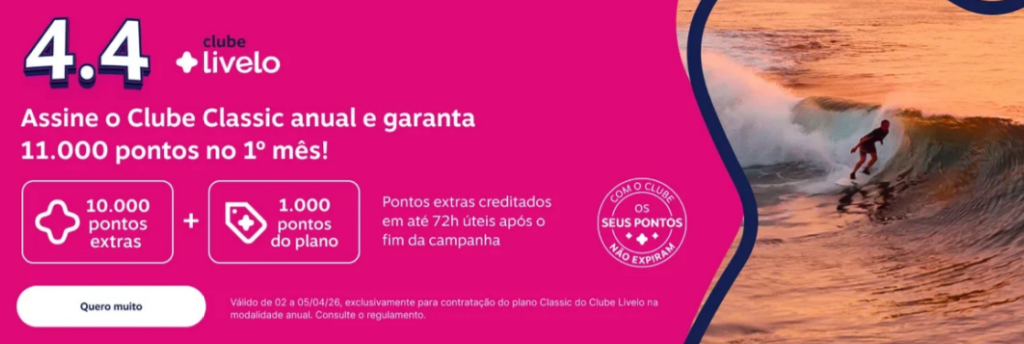 Já nos preparativos para o 4.4, a Livelo está com uma nova promoção para adesão ao Clube Classic. Nesta oferta, é possível receber 11 mil pontos no primeiro mês da assinatura anual. Vamos aos detalhes!