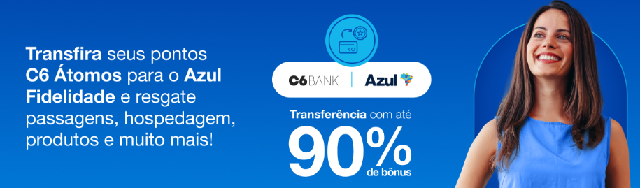 O Azul Fidelidade e o C6 Bank iniciaram mais uma nova oportunidade de até 90% de bônus na transferência de pontos! A promoção tem validade até o dia 11 de junho. Abaixo vamos trazer todos os detalhes dessa oferta.