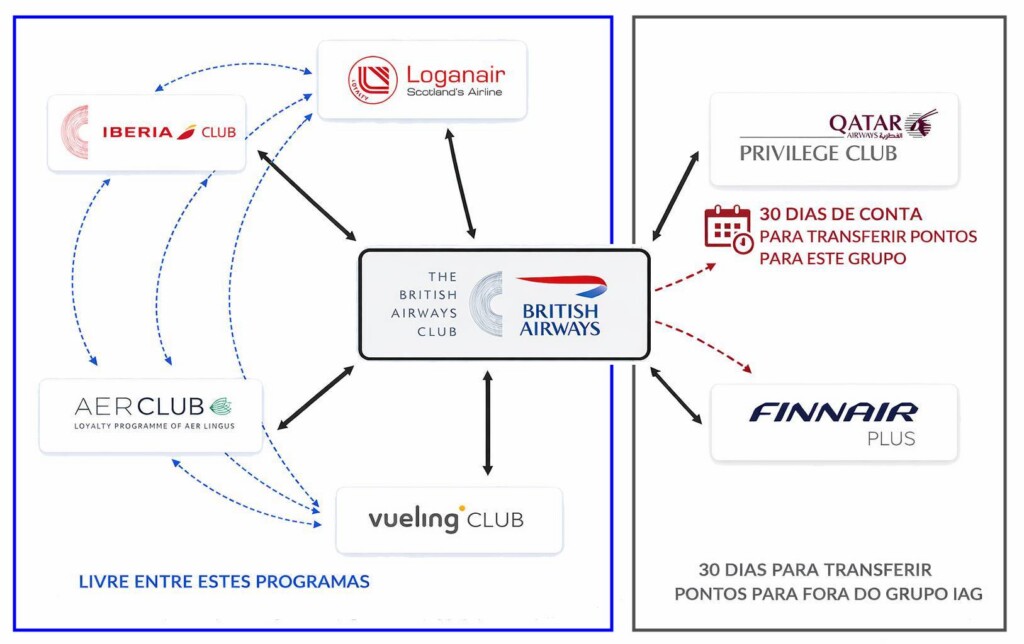 “Os membros devem ter tido uma conta AerClub, British Airways Club, Iberia Club ou Vueling Club por pelo menos trinta (30) dias antes de iniciar qualquer transferência de Avios desses programas para outros programas Avios (incluindo British Airways Club, Iberia Club, Vueling Club, AerClub, Qatar Airways Privilege Club, Finnair Plus e Loganair Loyalty). Esta restrição aplica-se apenas a transferências de saída de programas da IAG para parceiros. As transferências para programas da IAG não estão sujeitas a restrições.”