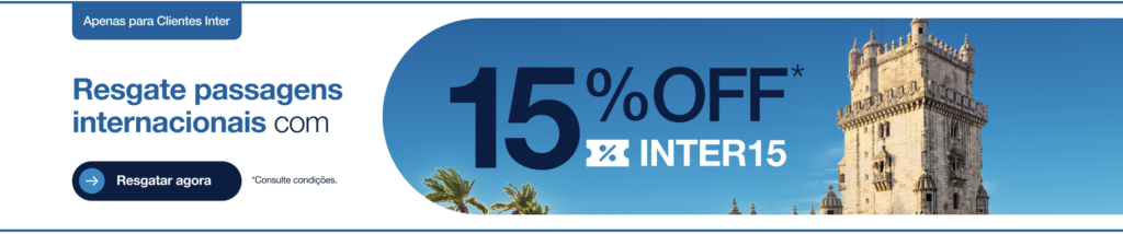 - Desconto de 15% para voos internacionais emitidos com o cupom INTER15
