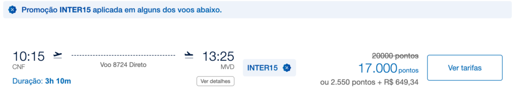 Confira abaixo um exemplo de emissão para o trecho Belo Horizonte (CNF) → Montevidéu (MVD), com data de viagem em 24 de junho de 2026, no qual é aplicado um desconto de 15% ao utilizar o cupom INTER15.