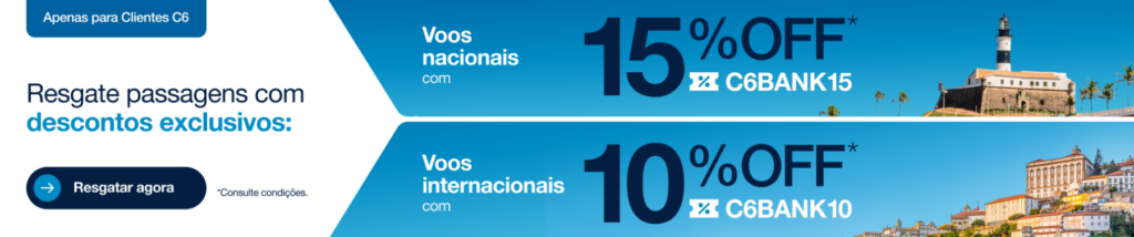 - Voos nacionais: 15% OFF com o cupom C6BANK15