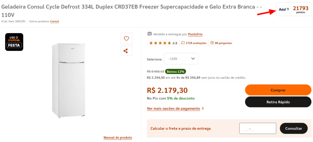 - Os clientes do Clube acumulam 34.869 pontos na compra da geladeira abaixo;