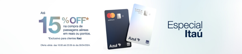 - 15% de desconto – Em passagens pagantes com cartões Azul Itaú