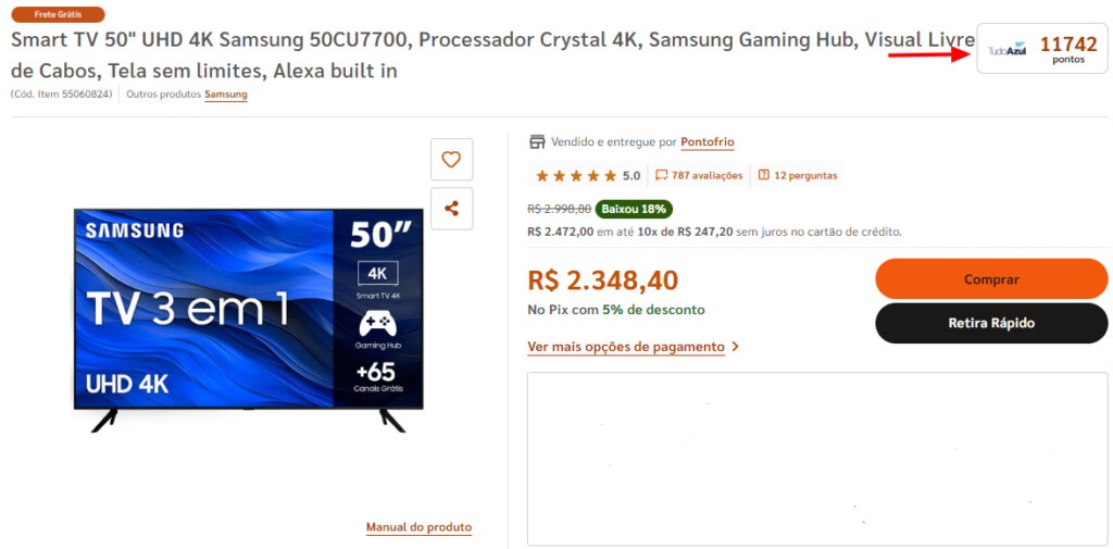 - Os clientes Clube Azul acumulam 18.787 pontos Azul na compra da Smart TV abaixo;