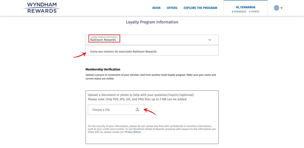 - No campo abaixo, adicione a comprovação de status do Radisson Rewards (pode ser um print da tela, mas deve aparecer seu nome completo)
