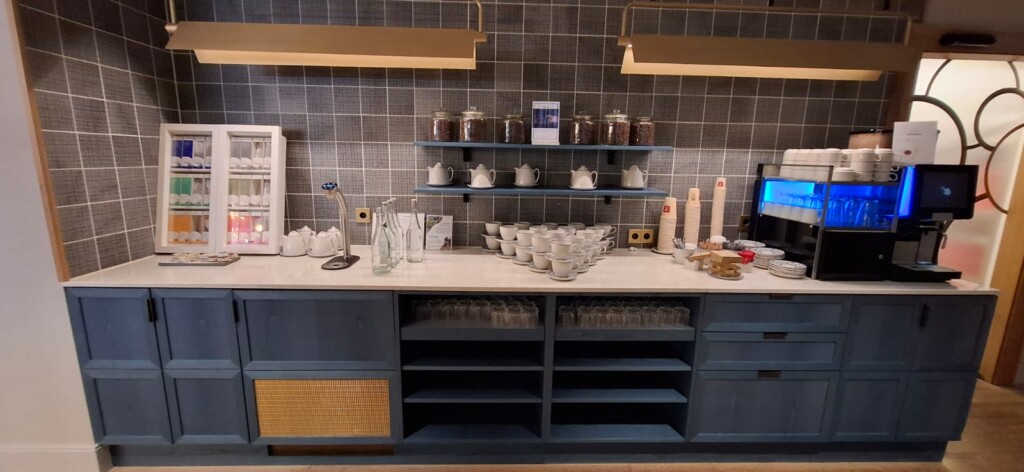 O local oferecia dois espaços com máquina de café e chás diversos.