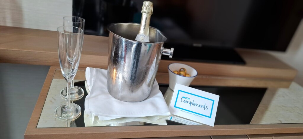 Depois de 5 minutos que havíamos entrado no quarto, um funcionário bate em nossa porta e nos traz um champanhe e chocolates acompanhados de um cartão com felicitações!