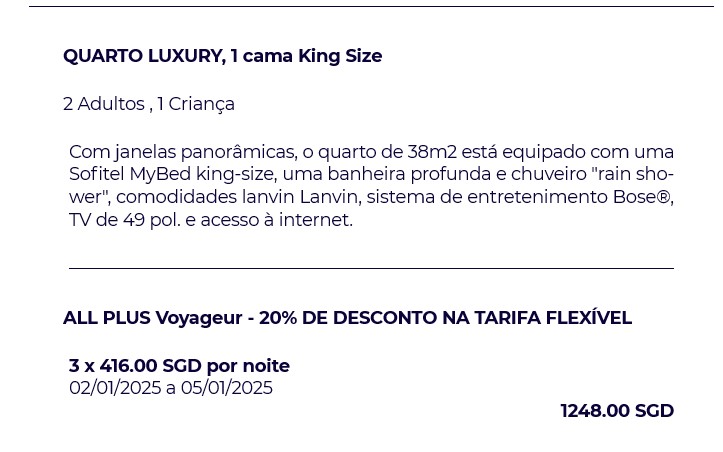 Por fim, em relação aos hotéis, optei por reservar em Singapura, o Sofitel City Centre, por três noites, quarto luxury, com pontos do programa ALL (possuo status platinum no programa), ao custo de 46k pontos e um saldo remanescente a pagar no hotel: