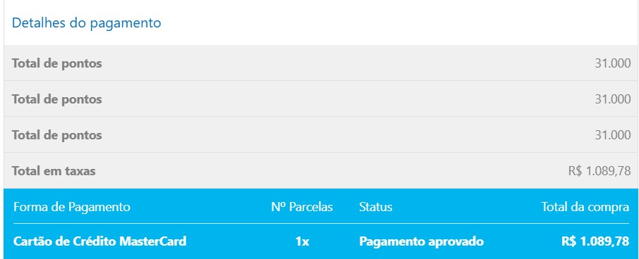 Assim, para cada passageiro, foram utilizadas 31k milhas, e mais R$ 1.089,78 de taxas no total.
