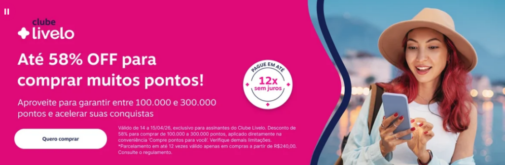 A Livelo está oferecendo até 58% de desconto na compra de pontos, válido para os assinantes do Clube Livelo. A oferta é válida até amanhã, dia 15 de abril, e você confere todos os detalhes a seguir!