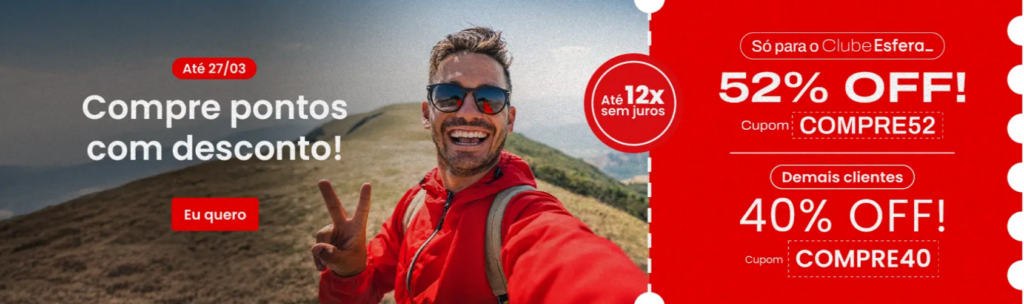 A Esfera está oferecendo aos seus clientes até 52% de desconto na compra de pontos. Esta oferta é válida até o dia 27 de março e você confere os detalhes a seguir.