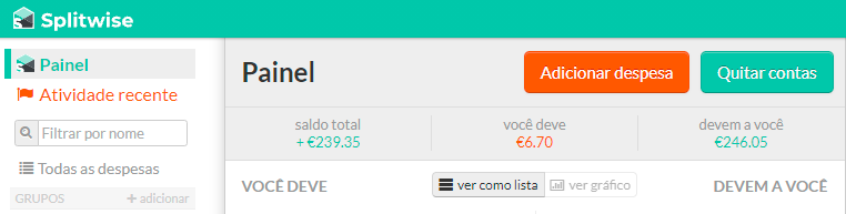 Como podem ver no meu painel acima, o app mostra um resumo de quanto você deve e quanto devem a você. O lado bom é que o aplicativo tem versão Web também, podendo ser acessada pelo computador, além de idioma em português brasileiro e suporte a inúmeras moedas diferentes.