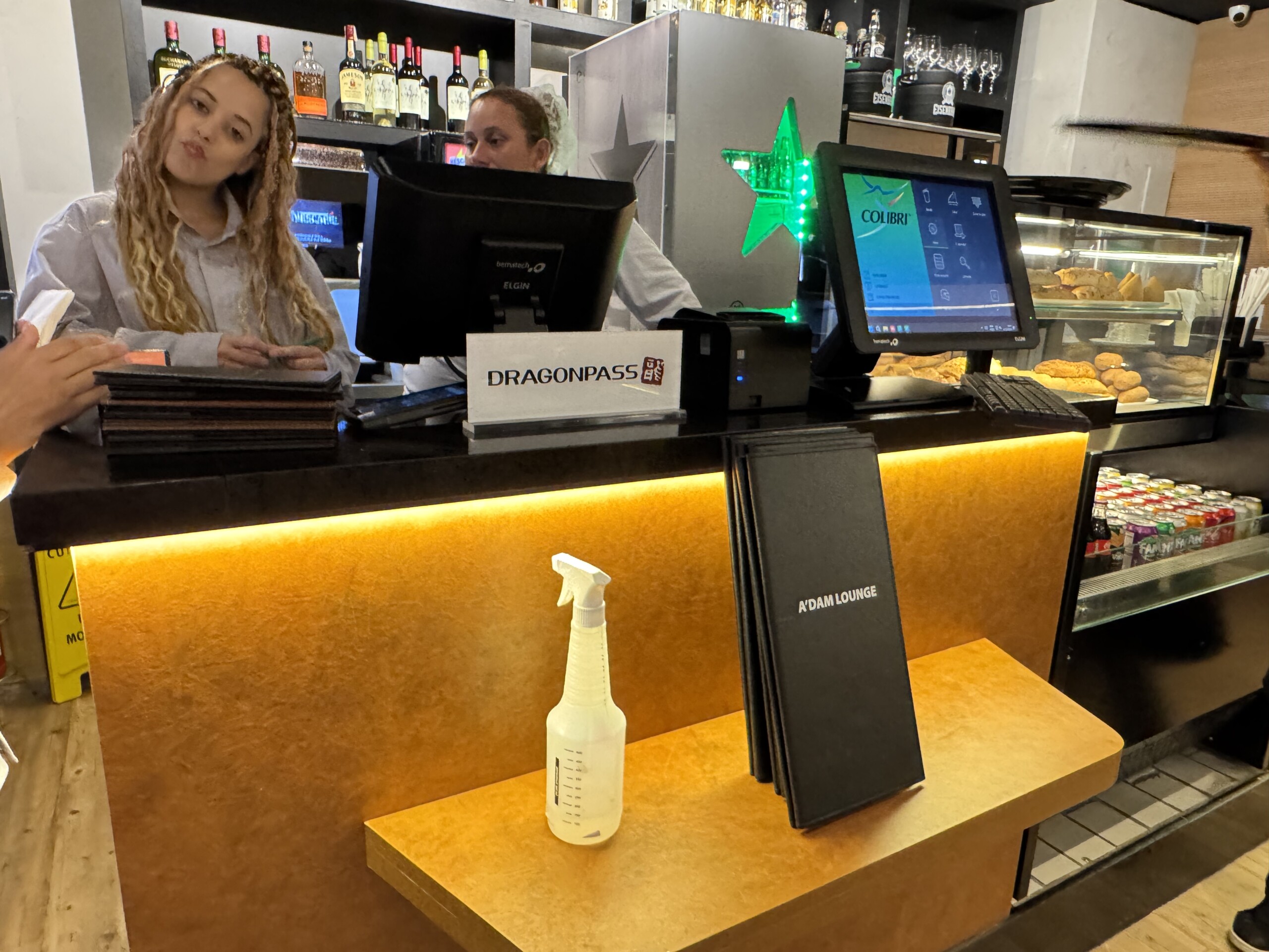 No caixa do estabelecimento, podemos ver claramente a informação da parceria com o Dragon Pass (com direito a beijinho da funcionária):