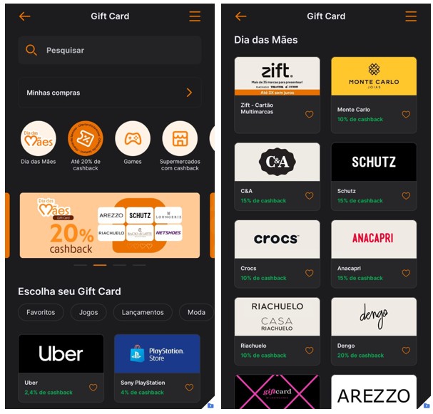 - Escolha o gift card desejado e finalize a compra pelo aplicativo;