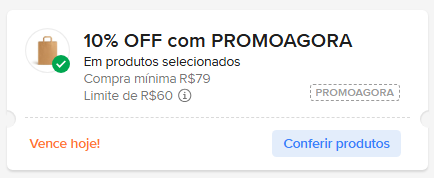 - PROMOAGORA – 10% OFF em compra mínima de R$ 79 com limite de R$ 60