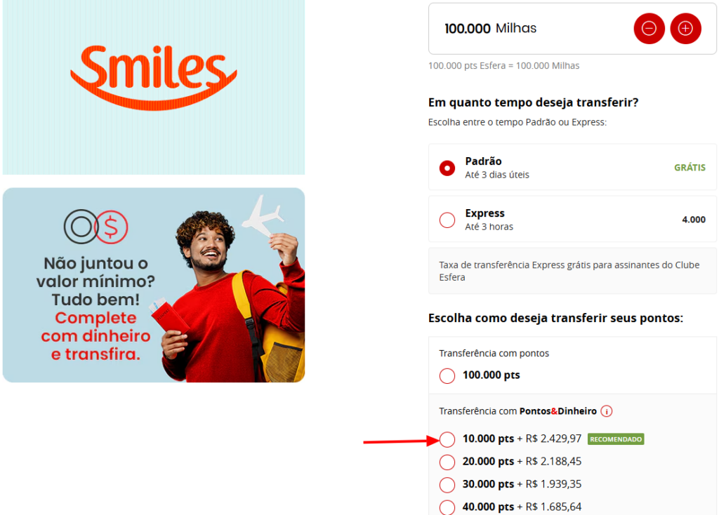 Se você está precisando de milhas Smiles com certa urgência, a opção Pontos & Dinheiro da Esfera pode ser uma boa oportunidade, pois é a forma de gerar milhas Smiles em grande quantidade pelo menor valor disponível atualmente. Contudo, é importante destacar que já houve ofertas melhores, com o milheiro Smiles a um valor bem menor.
