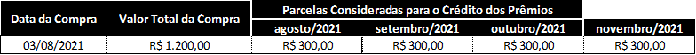 Para atingir a meta escolhida será considerado o valor total das novas compras parceladas realizadas exclusivamente no período da promoção. Portanto, não serão válidas as parcelas das compras realizadas antes do início desta campanha ou lançadas após o término do período de realização da campanha.