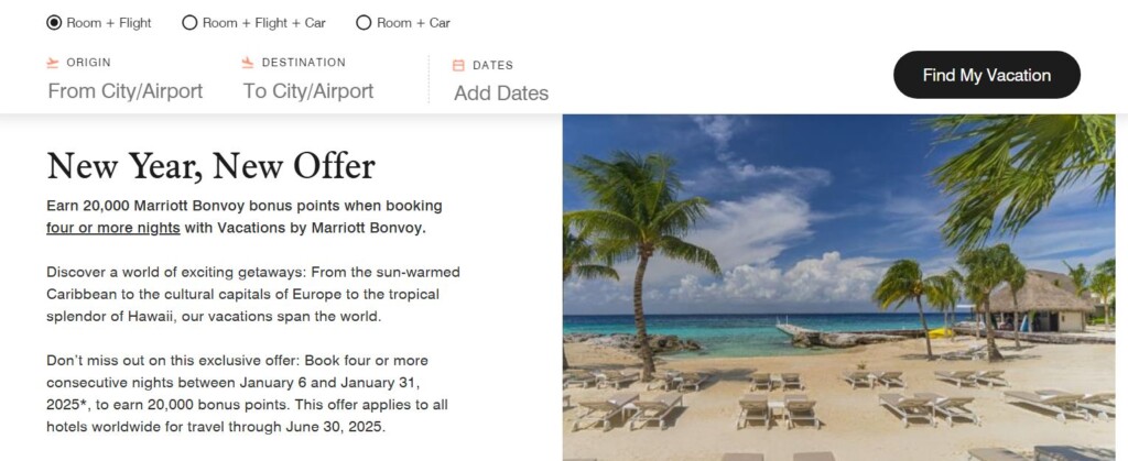 Nesta campanha, o programa está concedendo 20.000 pontos bônus para reservas de 4 noites ou mais feitas através do Vacations by Marriott Bonvoy. A promoção é válida para todas propriedades da Marriott ao redor do mundo, em reservas realizadas até 31 de janeiro e concluídas até 30 de junho de 2025.