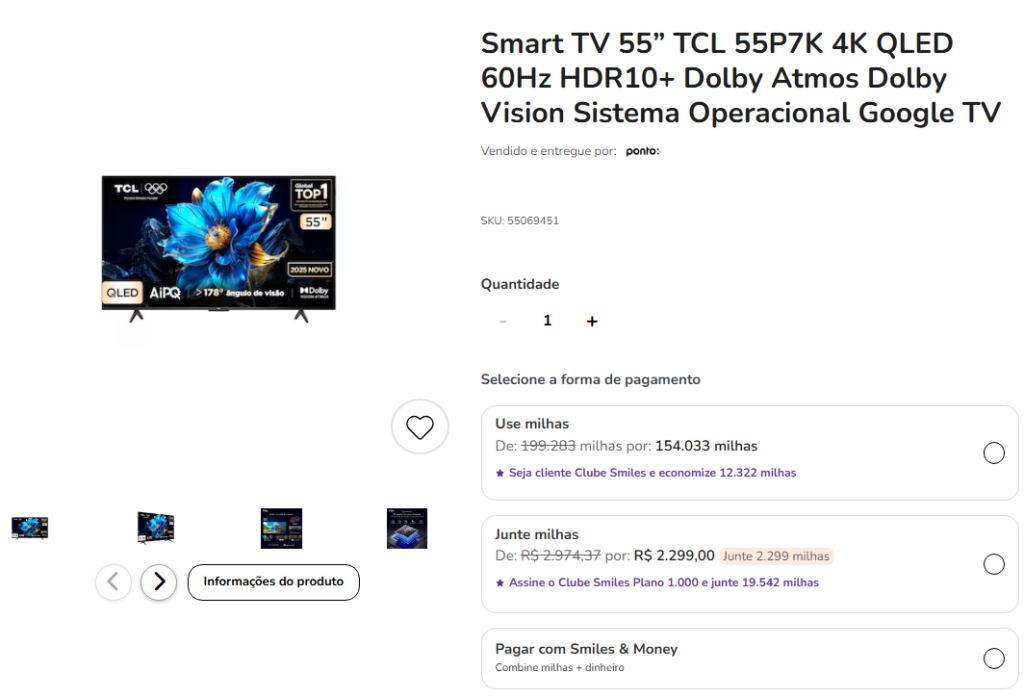 Na compra do Smart TV 55 da TCL abaixo, considerando a pontuação base (8,5 milhas), é possível acumular 19.541 milhas Smiles nesta promoção. Já os assinantes do Clube 20.000 ou Clientes Diamante recebem 22.990 milhas Smiles (10 milhas).