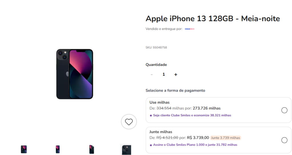 Na compra do iPhone 13 128GB – Meia Noite, considerando a pontuação base (8,5 milhas), é possível acumular 31.782 milhas Smiles nesta promoção. Já os assinantes do Clube 20.000 ou Clientes Diamante recebem 37.390 milhas Smiles (10 milhas).