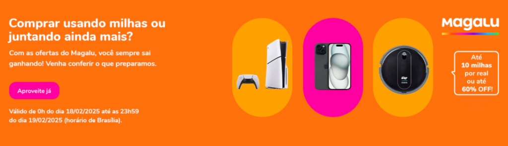 O Shopping Smiles está com uma promoção em parceria com o Magalu. Nessa oferta, você pode acumular até 10 milhas por real gasto em categorias selecionadas, incluindo produtos como iPhone, PlayStation e Notebooks vendidos e entregues pela Magalu. A oferta é válida apenas até hoje, dia 19 de fevereiro, e você confere todos os detalhes a seguir.