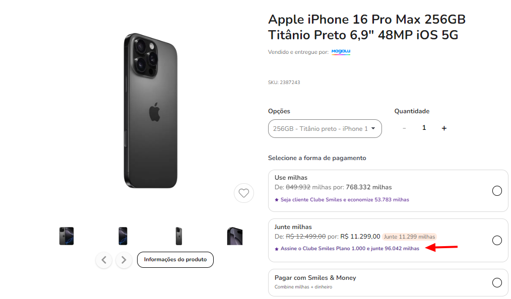 Na compra do iPhone abaixo é possível acumular até 112.990 milhas Smiles nesta promoção.