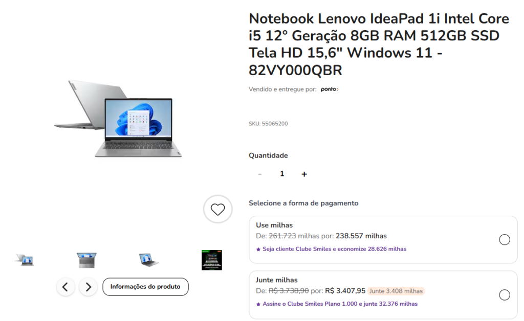 Na compra do Notebook Le Novo 1i – 8GB – 512SDD, considerando a pontuação base (9,5 milhas), é possível acumular 32.376 milhas Smiles nesta promoção. Já os assinantes do Clube 20.000 ou Clientes Diamante recebem 37.477 milhas Smiles (11 milhas).