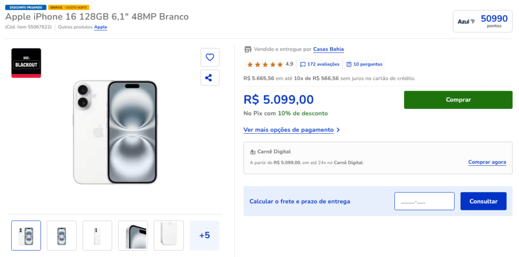 - Os clientes do Clube Azul acumulam 81.584 pontos na compra do iPhone 16 abaixo;