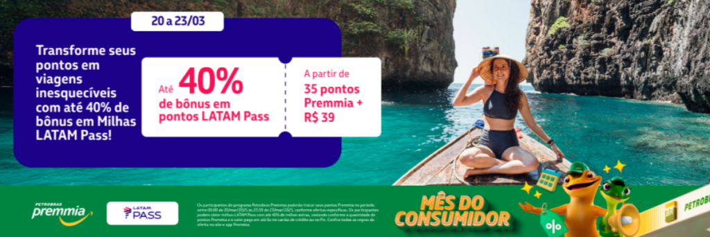 O LATAM Pass está com uma promoção em parceria com o Premmia, oferecendo até 40% de bônus na transferência de pontos. A oferta é válida até hoje, dia 23 de março. Confira as principais condições abaixo.