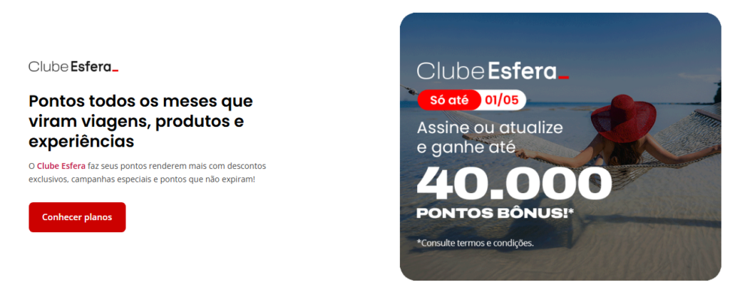 A Esfera volta com mais uma campanha de assinatura do clube, oferecendo até 40 mil pontos de bônus para clientes que realizarem adesão ou upgrade de plano. A oferta é válida até 1° de maio. Confira abaixo os detalhes e veja como aproveitar!