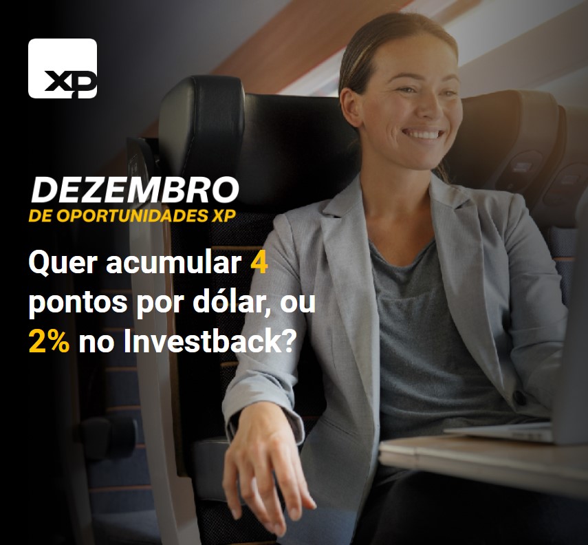 Até 31 de dezembro, os clientes que investirem R$ 200 mil na XP garantirão benefícios exclusivos, como investback turbinado, durante 6 meses. Serão 4 pontos por dólar gasto ou cartão de crédito ou 2% em investback.