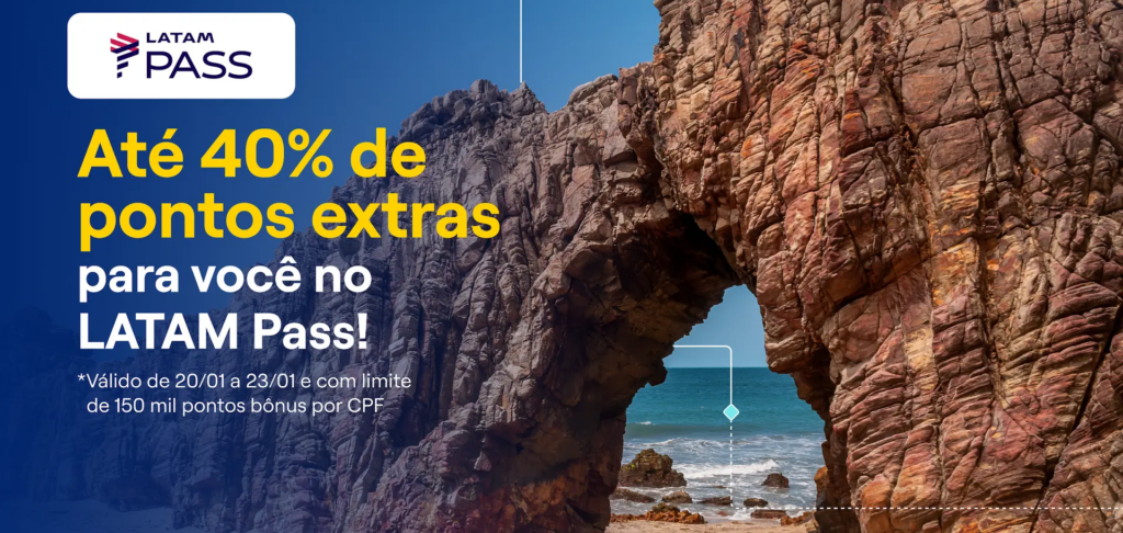 - 40% de bônus — Assinantes do clube LATAM Pass e/ou titulares dos cartões LATAM Pass Itaú