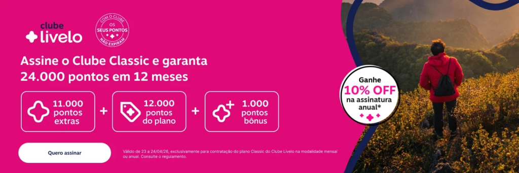 A Livelo trouxe de volta sua promoção de assinatura do clube, em que oferece 24.000 pontos, tanto no plano anual quanto no mensal do Clube Classic. A oferta é válida até amanhã, dia 24 de abril. Vamos aos detalhes!