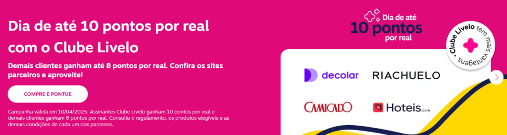 A Livelo está com uma série de promoções ativas em diversas lojas parceiras, como Camicado, Riachuelo, Seculus, entre outras. Durante essa ação, é possível acumular até 15 pontos por real gasto em compras online. No entanto, como as condições variam de acordo com cada loja, é fundamental conferir os detalhes de cada oferta. Venha conferir e aproveite!