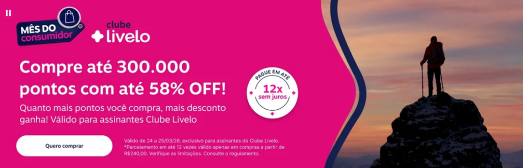 A Livelo voltou com uma oferta de compra de pontos com até 58% de desconto. A promoção é válida até amanhã, dia 25 de março, e está disponível para todos os assinantes do clube. Confira a seguir os detalhes e veja como aproveitar essa oportunidade!