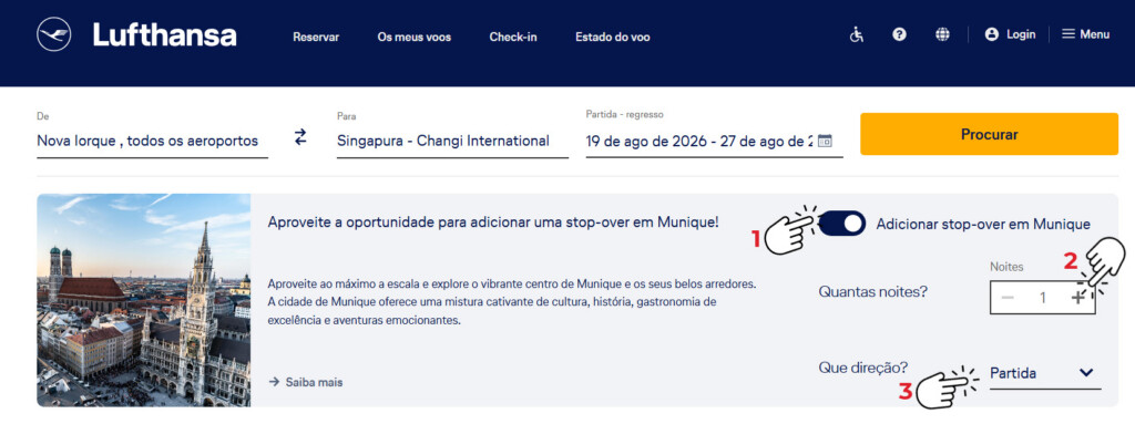 Durante a compra da passagem no site da companhia, é possível adicionar um stopover em Munique tanto na ida quanto na volta. O tempo de permanência pode variar de 24 horas até sete dias, dependendo da preferência.