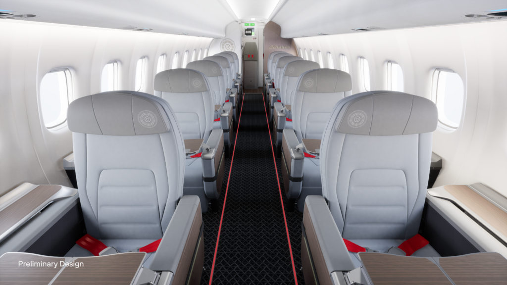 Com 26 assentos na configuração 1-1, a nova cabine “ATR HighLine All-Business Class” marca a estreia de um serviço VIP em voos entre Raiatea e Bora Bora. Essa é a primeira vez que a Air Tahiti adota um interior totalmente executivo em seus turboélices. Segundo a fabricante, o layout foi desenvolvido com foco em conforto elevado, eficiência operacional e baixa emissão de carbono.