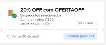 - OFERTAOFF – 20% OFF em compra mínima de R$ 29 com limite de R$ 60.