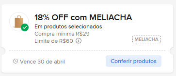 - MELIACHA – 18% OFF em compra mínima de R$ 29 com limite de R$ 60.