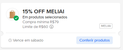 - MELIAI – 15% OFF em compra mínima de R$ 79 com limite de R$ 60