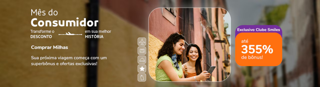 O Mês do Consumidor está chegando ao fim! A Smiles está oferecendo até 355% de bônus na compra de milhas, com diferentes percentuais conforme sua categoria no Clube Smiles. A promoção é válida até as 21h do dia 31 de março.