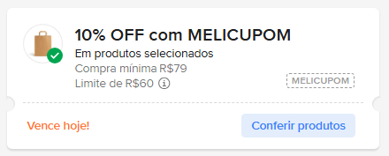 - MELICUPOM – 10% OFF em compra mínima de R$ 79 com limite de R$ 60.