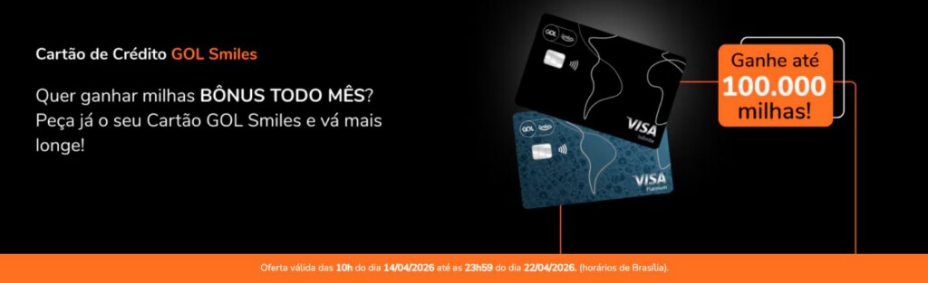 A Smiles lançou uma nova oferta para os cartões de crédito GOL Smiles, com bônus total que pode chegar a 100.000 milhas para quem solicitar o produto até o dia 22 de abril.