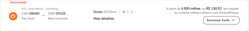 Abaixo você confere um exemplo de emissão partindo de São Paulo, com destino a Belo Horizonte por 4.500 milhas Smiles.