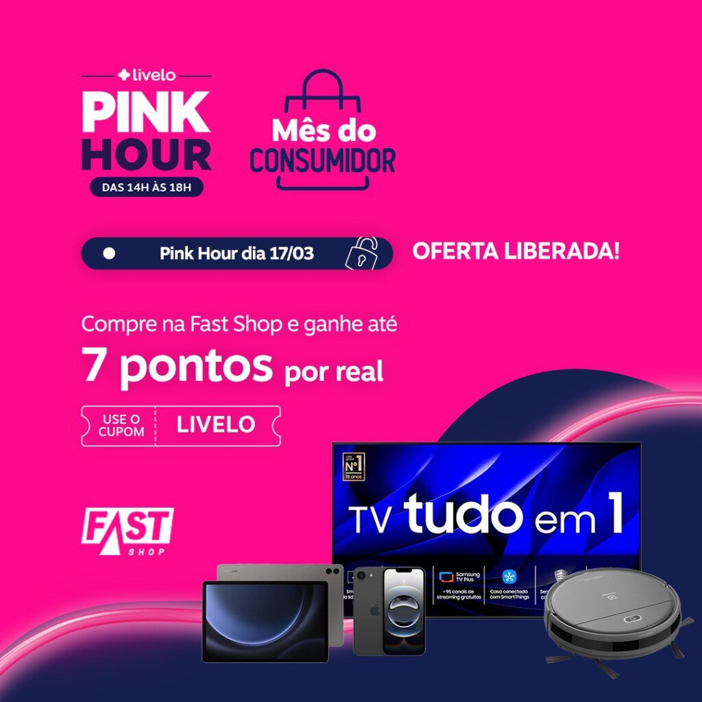 Na Pink Hour de hoje, a Fast Shop está oferecendo até 7 pontos por real gasto para assinantes do Clube Livelo e do Fast Prime. Mas atenção: a oferta é por tempo limitado e encerra às 18h de hoje, 17 de março. Confira os detalhes e aproveite!