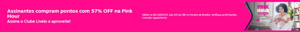 Em mais uma campanha “Pink Hour”, a Livelo está oferecendo aos assinantes do Clube 57% de desconto na compra de até 100 mil pontos. Abaixo, confira os detalhes desta oferta válida até às 18h de hoje, dia 10 de abril.