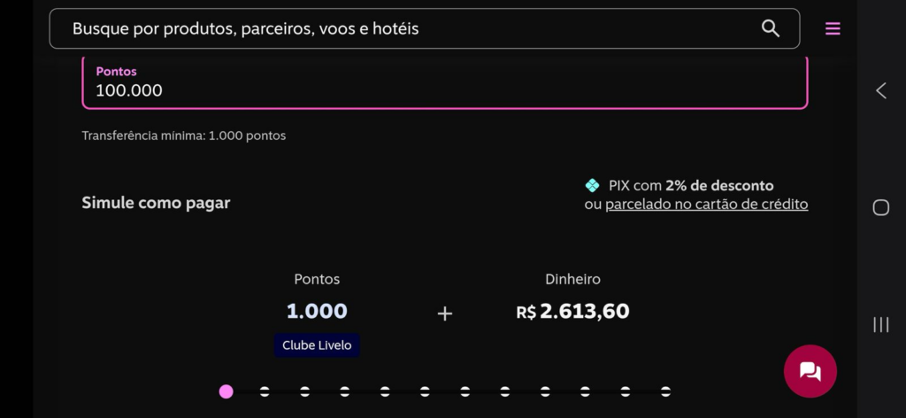 O valor do milheiro está saindo por R$ 26,40 no pagamento parcelado em até 6x sem juros, ou seja, enviando 100 mil pontos, você utiliza 1 mil pontos (1% do valor total) e completa os 99 mil pontos. Você irá pagar um total de R$ 2.613,60. Se optar pelo pagamento à vista no PIX, você irá pagar R$ 2.561,33, ou seja, o milheiro está custando R$ 25,87.